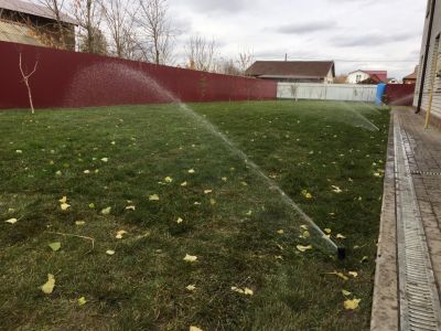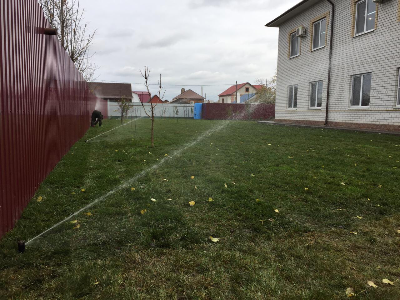 Сначала завезли плодородный грунт, распределили по участку. Сделали планировку грунта с уклоном. Установили: систему автоматического полива, накопительную емкость, насосное оборудование Espa. Лучшим решением для полива такой площади является установка роторных оросителей веерного типа. Это позволяет проливать большие участки малым количеством оборудования и значительно сократить расход воды. Уложили рулонный газон. Несмотря на прохладную погоду и ноябрь месяц газон отлично приживается. Уже с ранней весны будет радовать клиента своим изумрудным цветом.